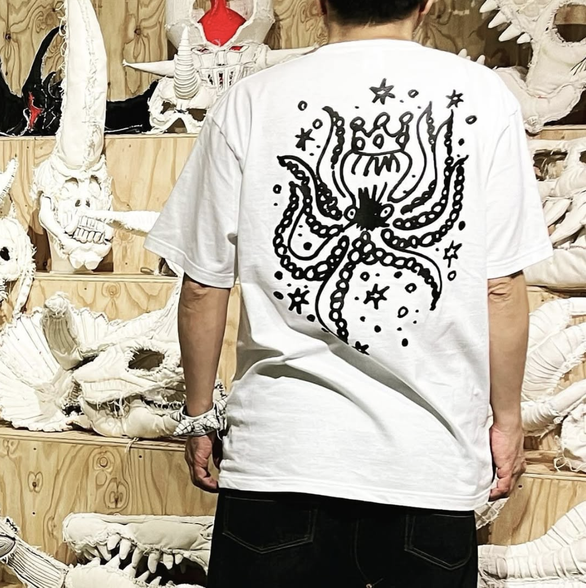 上の写真(背中は下田さん本人です)のように、作中に出てくるタコが大きく印刷されたTシャツ。